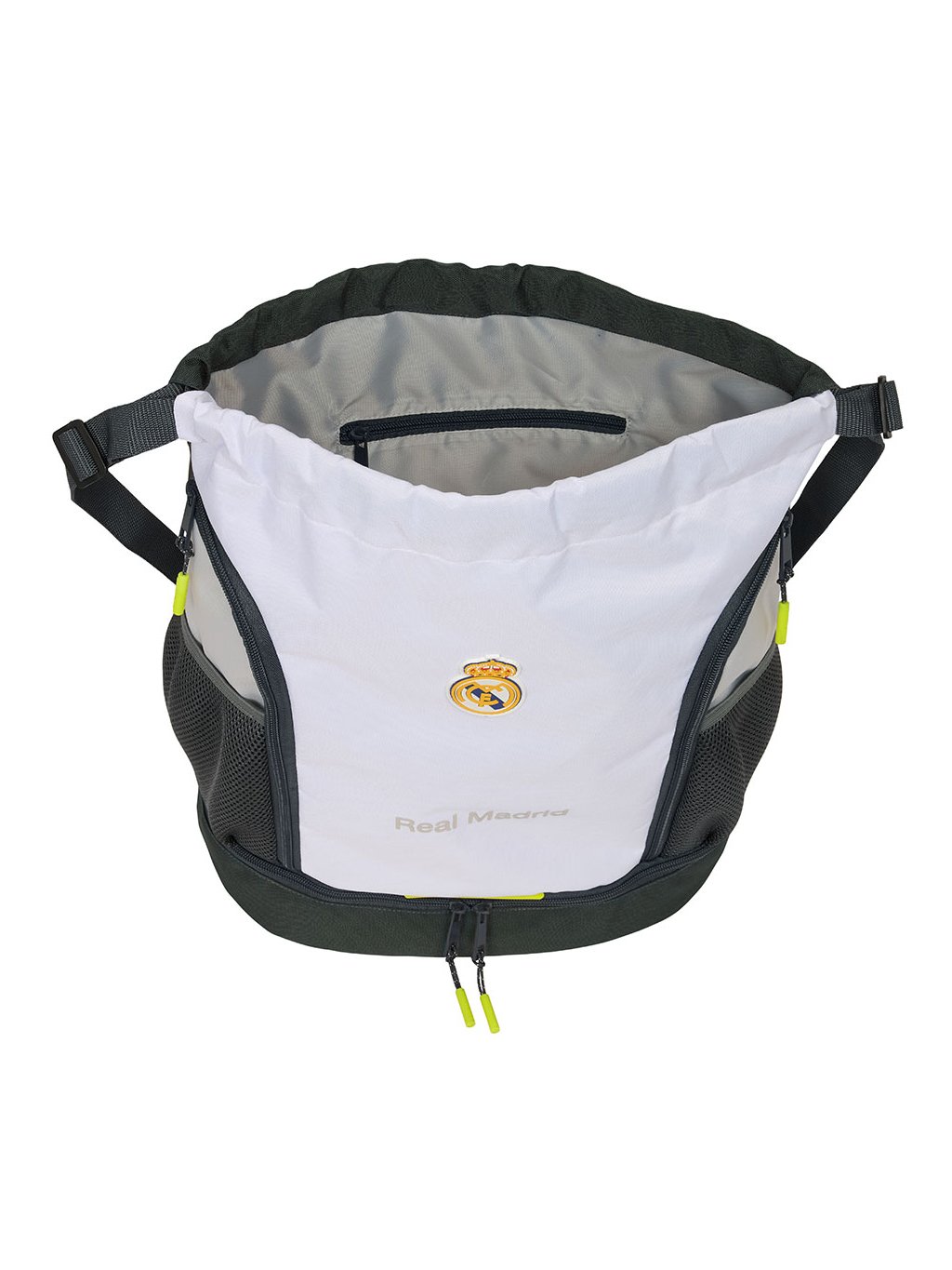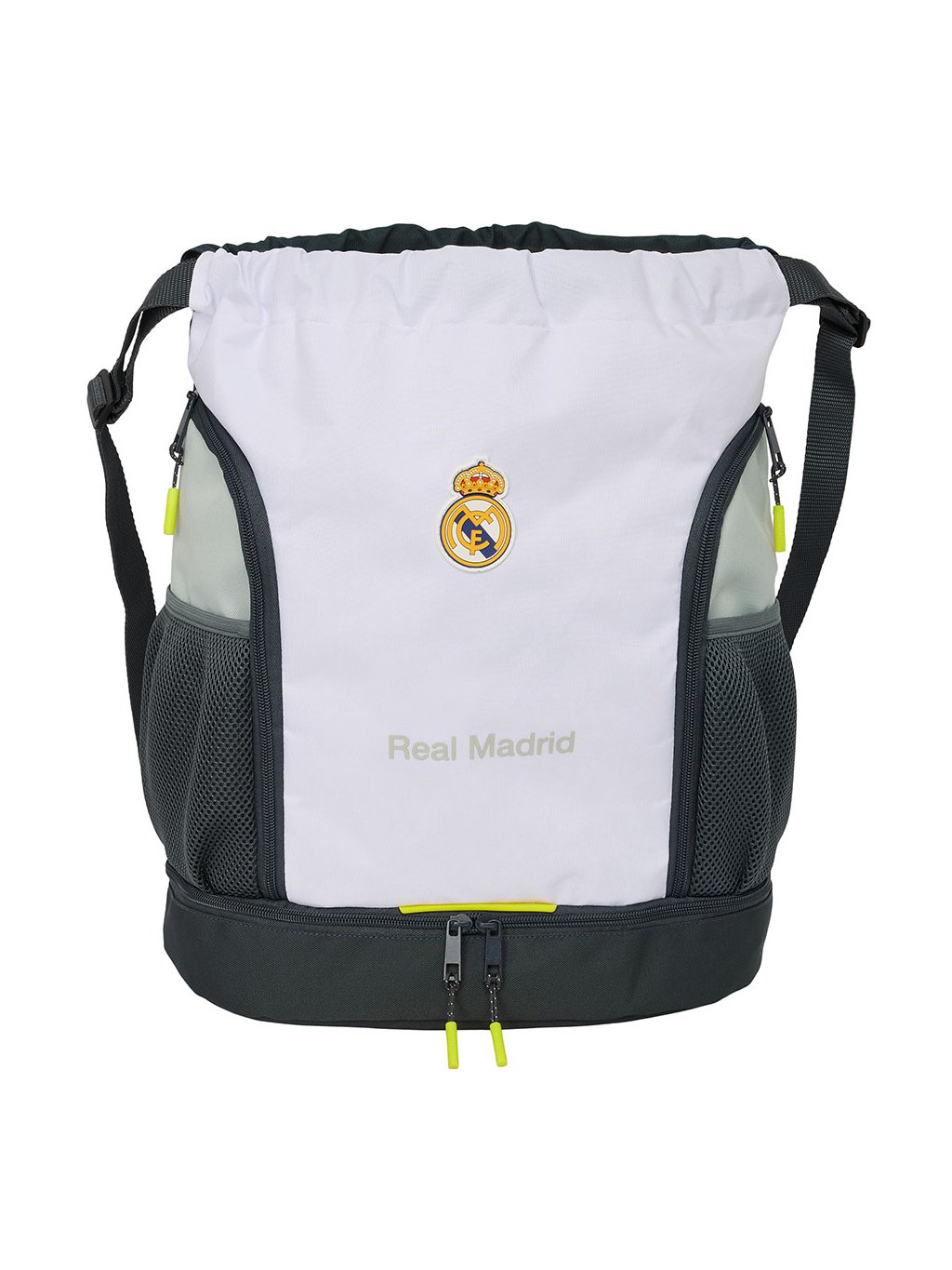 Praktický vak-batoh Real Madrid je doporučený pro fanoušky fotbalu, nabízí vnitřní kapsu na zip, postranní síťované kapsy na láhve, spodní přihrádku na zip s obousměrným otevíráním pro snadný přístup a další postranní kapsy na zip. Nastavitelné popruhy z pásky zajišťují pohodlné nošení. Rozměry jsou 340 × 150 × 430 mm a objem 21,93 litrů.