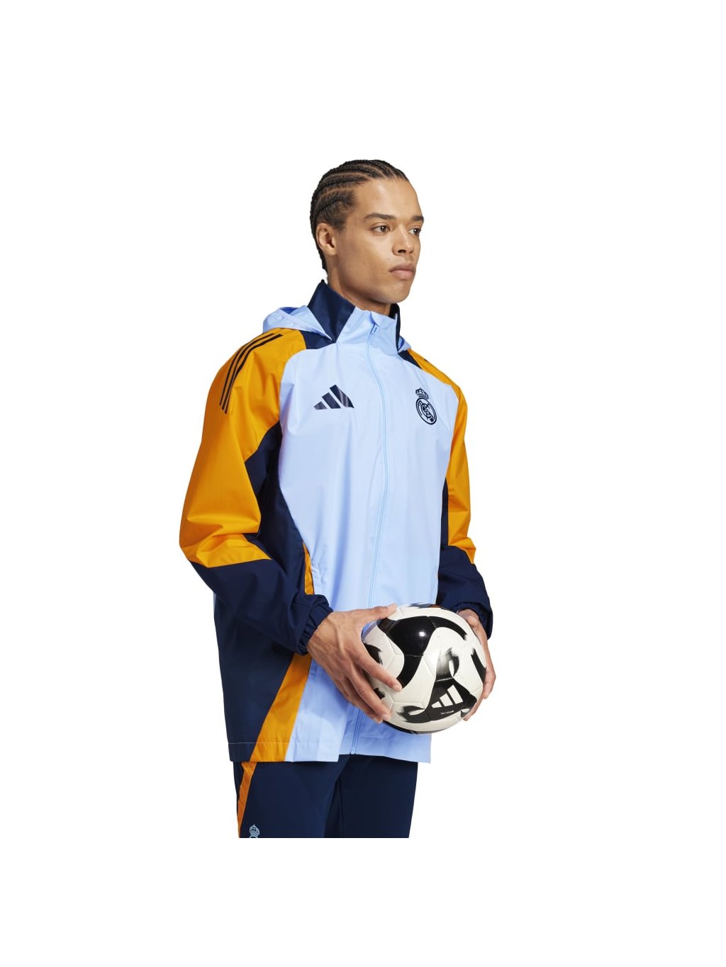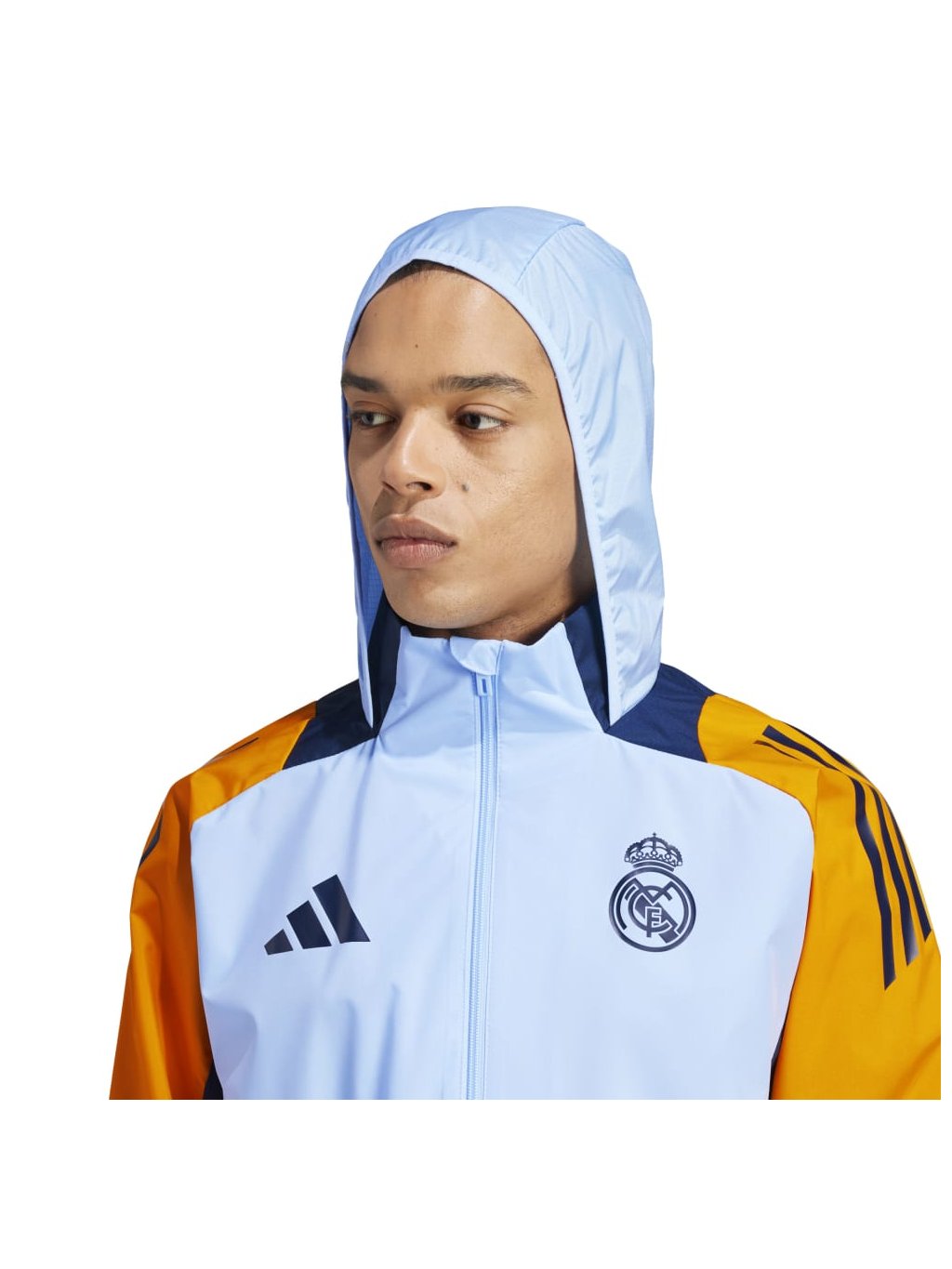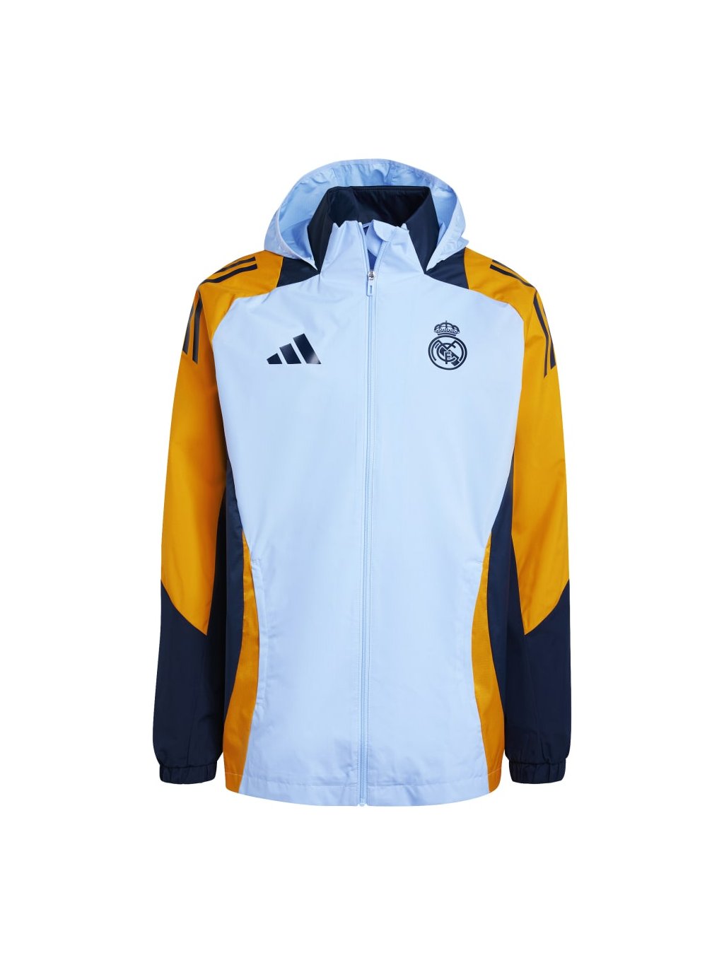 Trénuj ve stylovém fotbalovém outfitu za každého počasí. Tato bunda adidas Real Madrid ti umožní vyniknout na hřišti i za špatných podmínek. Odolný vodoodpudivý úplet tě ochrání před větrem a mírným deštěm. Do kapes na zip si můžeš schovat energetickou tyčinku, takže budeš mít dostatek sil i při náročných trénincích.