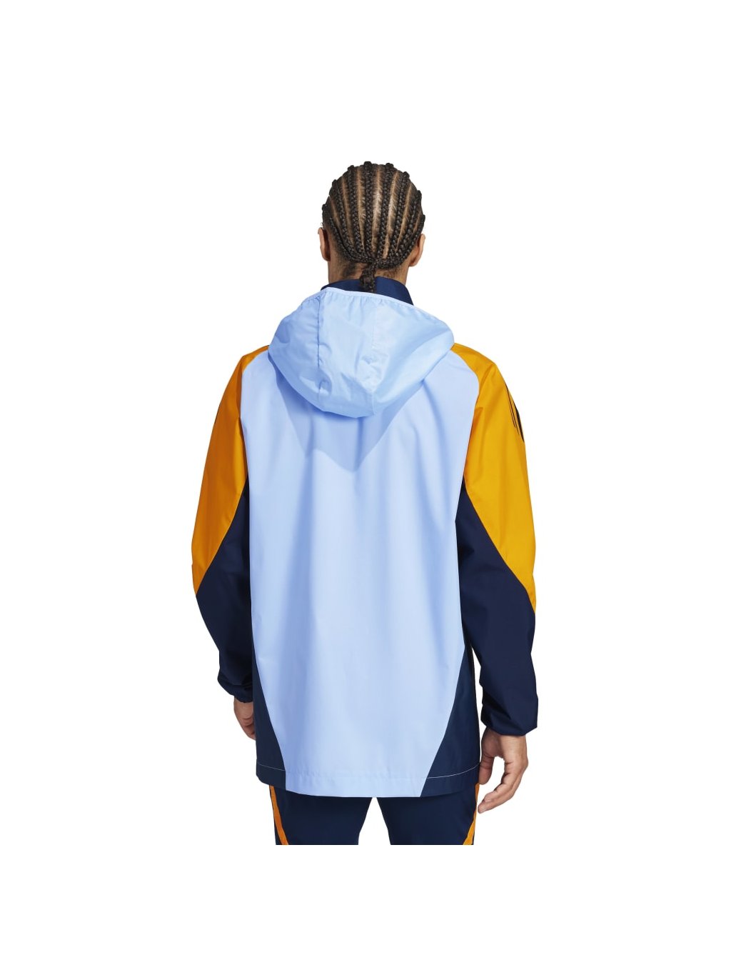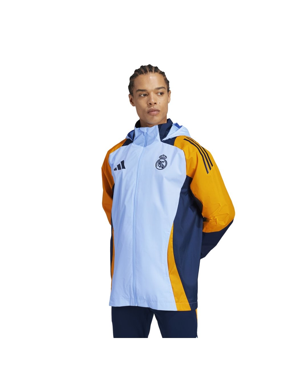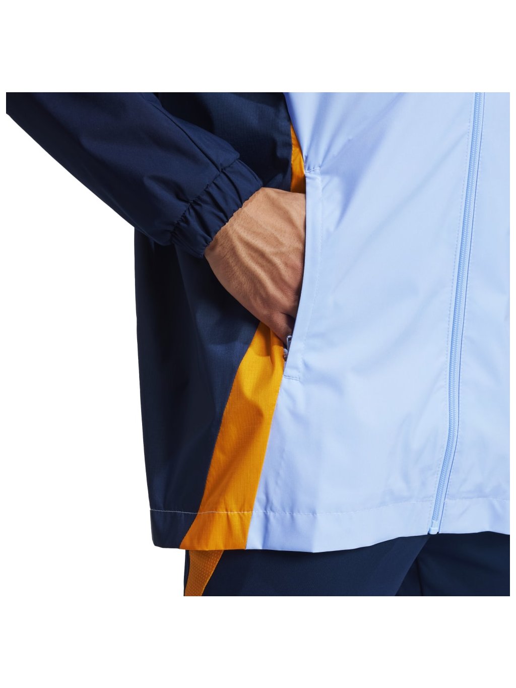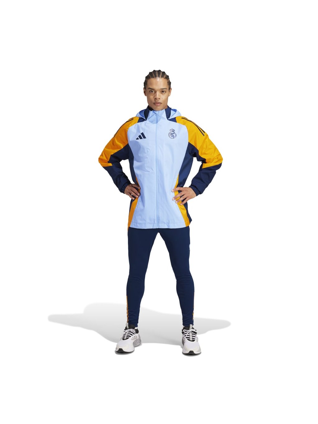 Trénuj ve stylovém fotbalovém outfitu za každého počasí. Tato bunda adidas Real Madrid ti umožní vyniknout na hřišti i za špatných podmínek. Odolný vodoodpudivý úplet tě ochrání před větrem a mírným deštěm. Do kapes na zip si můžeš schovat energetickou tyčinku, takže budeš mít dostatek sil i při náročných trénincích.