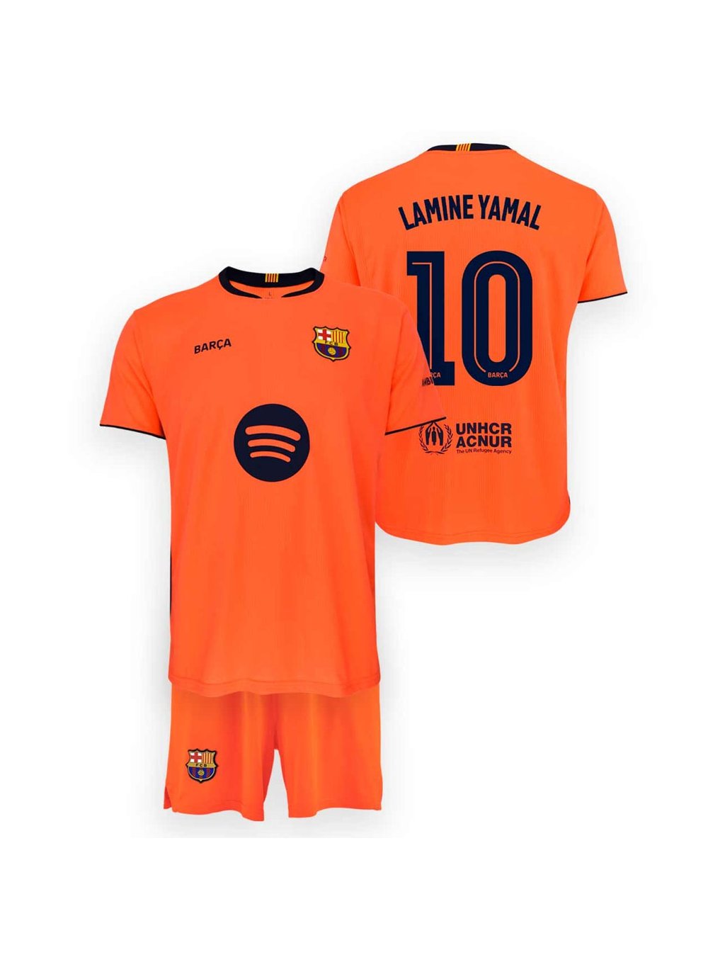 Oblékněte mladé fanoušky do stylu Barçy s tímto juniorským setem třetí sady dresů. Součástí je triko a kraťasy v moderní lososové barvě s kontrastními detaily a jménem i číslem Lamina Yamala na zádech. Autentické provedení s oficiálními sponzory a klubovými prvky zajišťuje stejný vzhled, jaký nosí hráči prvního týmu. Ideální na trénink, hru i fandění.