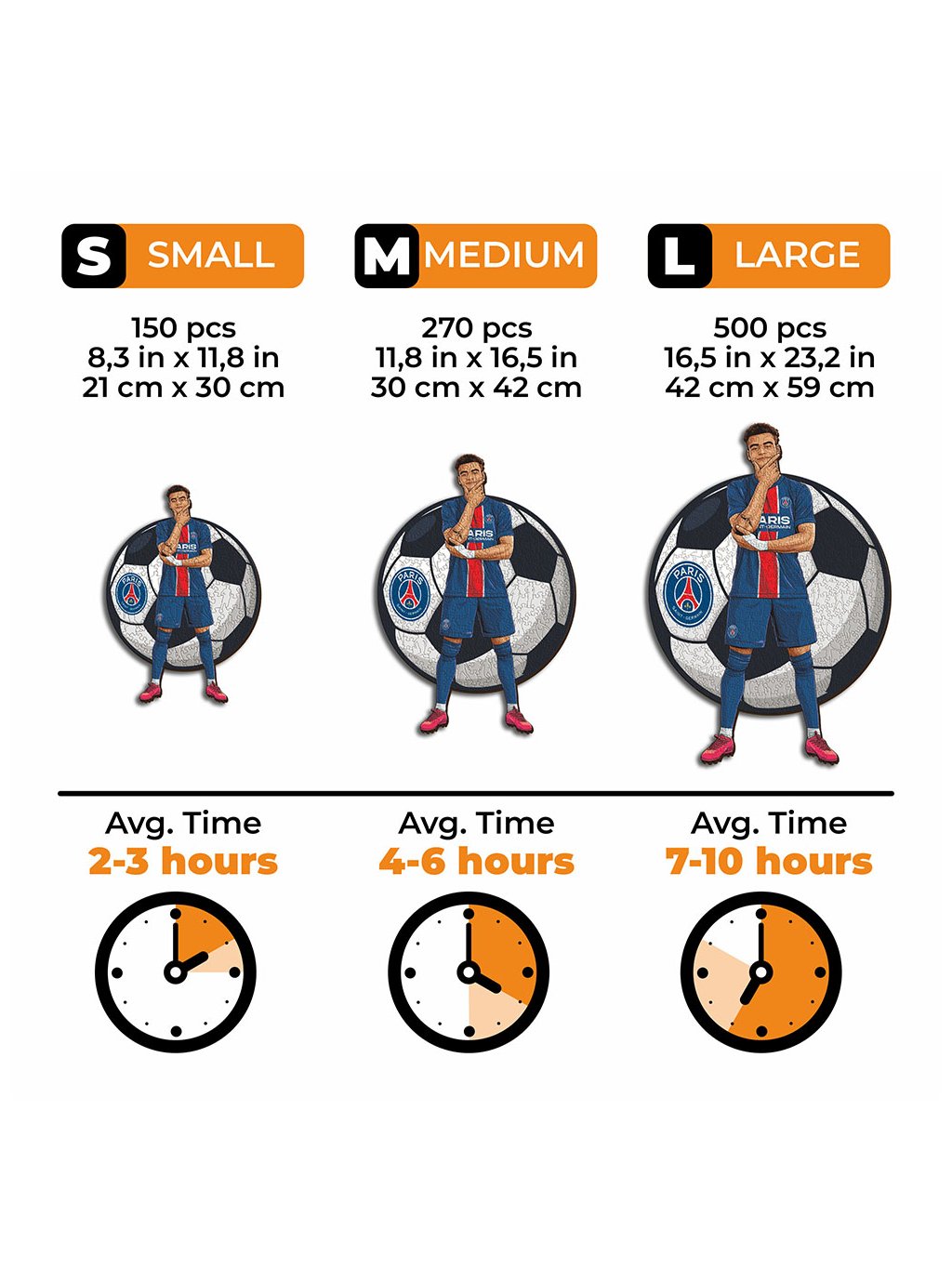Toto jedinečné dřevěné puzzle s motivem mladé hvězdy Désirého Douého zachycuje jednoho z největších talentů Ligue 1 v akci. Každý dílek má originální tvar a některé znázorňují prvky spojené s jeho dynamickým stylem hry – míče, dresy či fotbalové symboly Francie. Skvělý způsob, jak spojit zábavu a vášeň pro fotbal, ideální pro děti, dospělé i sběratele sportovních suvenýrů.