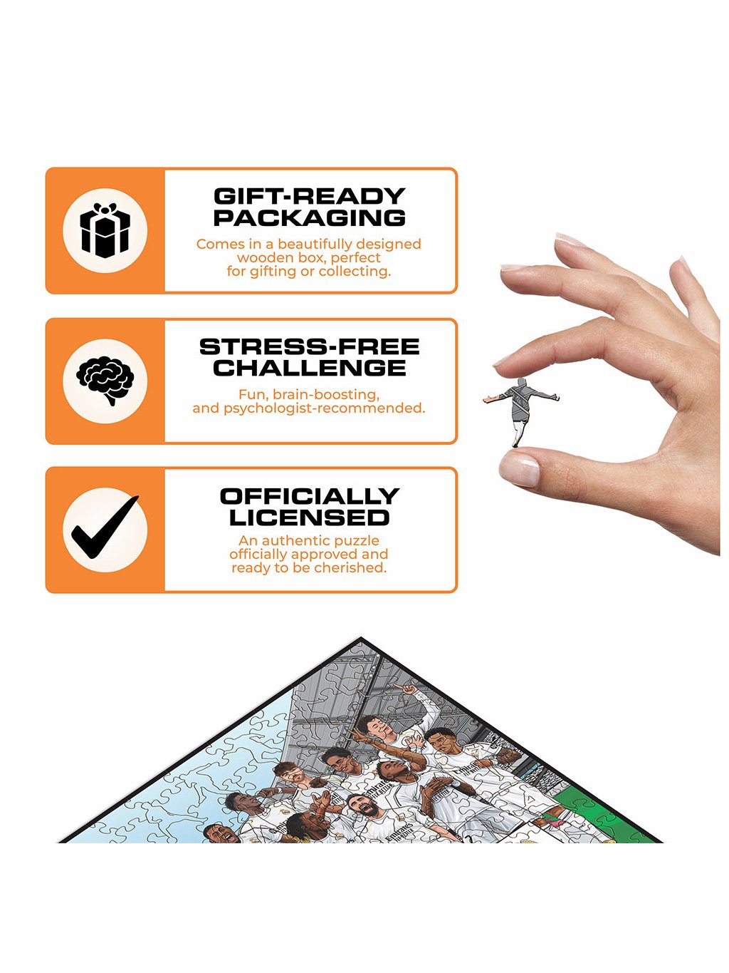 Jedinečné puzzle s motivem týmu pro sezónu 2025/26 potěší každého madridistu a vytvoří vzpomínky na dlouhé roky. Každý dílek má originální tvar a některé jsou inspirovány fotbalovými prvky a ikonickými momenty ze světa Realu.