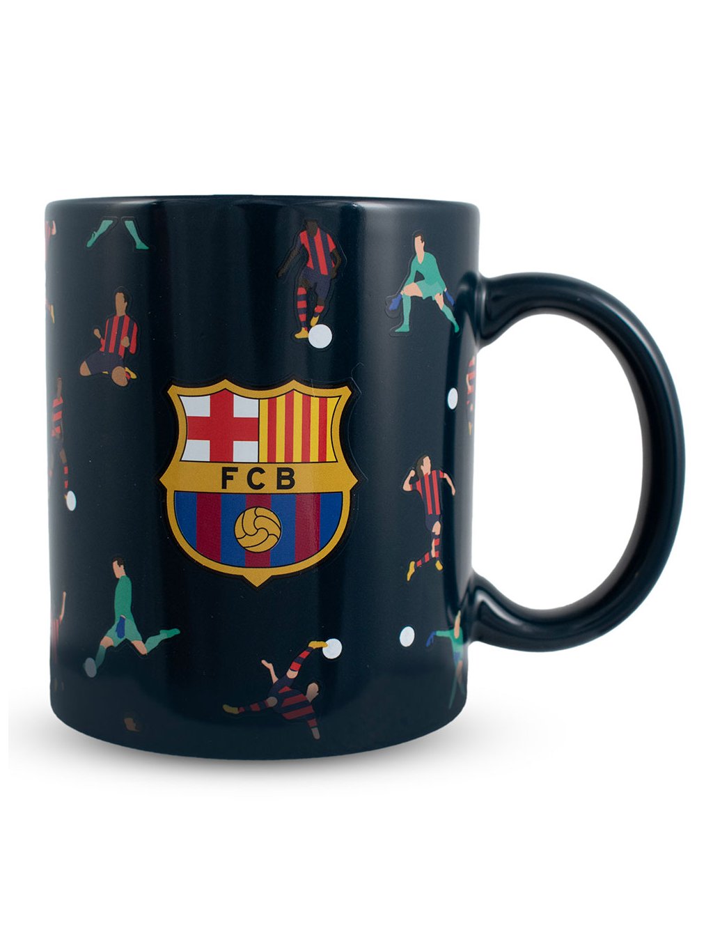Hrnek FC Barcelona Player je keramický hrnek ideální na každodenní kávu nebo čaj pro fanoušky Barçy. Tmavě modré provedení zdobí opakující se hráčský motiv a plnobarevný klubový znak FC Barcelona. Glazovaný, vypalovaný povrch a tmavě modré ucho zajišťují odolnost i stylový vzhled.
