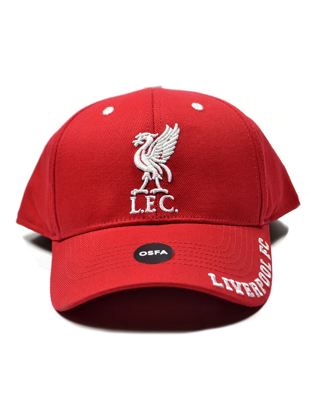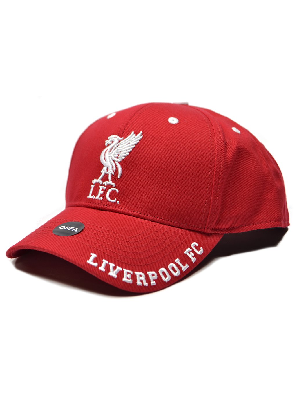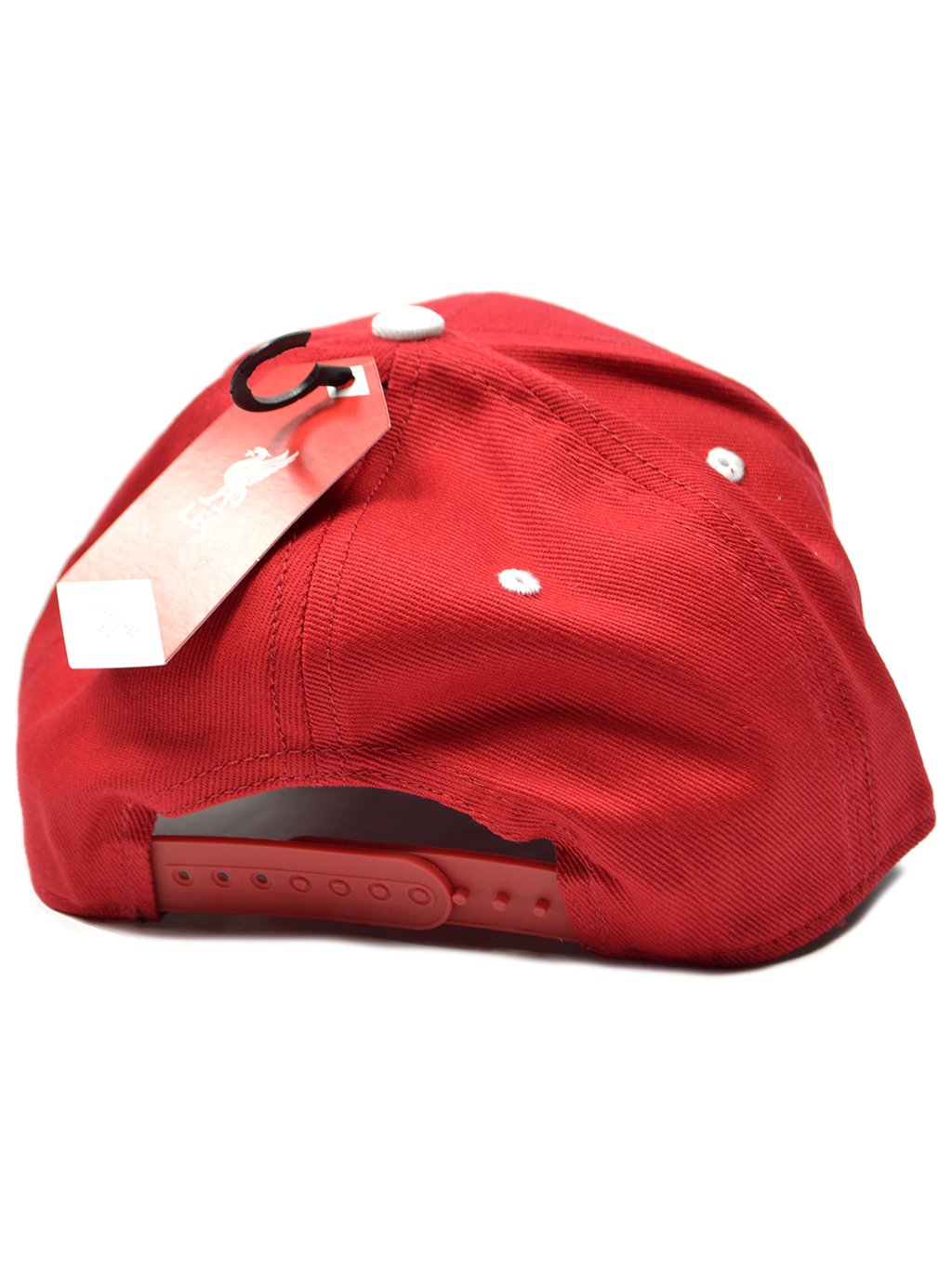 Červená kšiltovka Liverpool FC s prohnutým štítem v klasickém designu.
