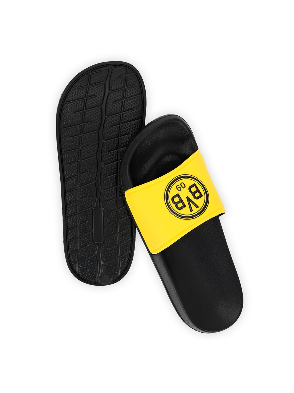 Černé a žluté žabky Borussia Dortmund z kolekce Iconic Lifestyle zajistí, že si každý fanoušek skutečně užije léto. Snadno se nazouvají a zouvají, a díky retro logu jsou ideální obuví pro pohodovou dovolenou. Tyto plážové žabky s černými podrážkami a žlutými pásky jsou nezbytností pro každého fanouška Borussie, který chce mít svůj tým u sebe po celé léto, dokonce i na krátkých cestách od lehátka k baru nebo bazénu. Jsou vyrobeny z polyesteru.