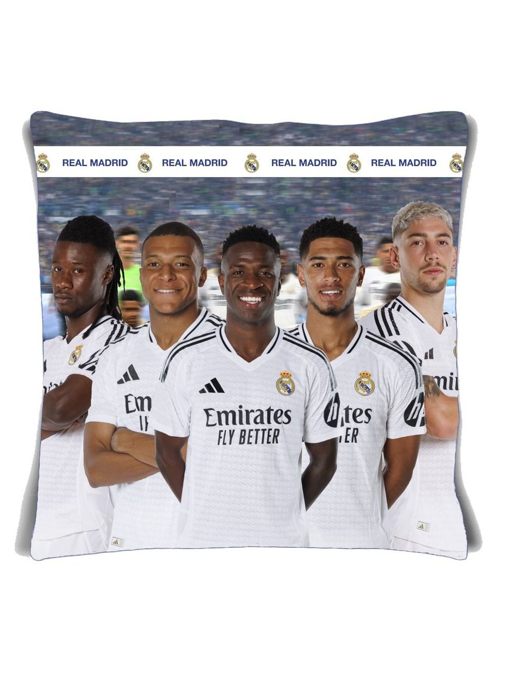 Polštář s motivem hráčů Real Madrid o rozměrech 40x40 cm je perfektním doplňkem pro fanoušky klubu. Vyrobený z kvalitních materiálů, nabízí měkkost a pohodlí. Jeho design zobrazuje oblíbené hráče, což z něj činí skvělý dekorativní prvek do každé místnosti, kde chcete vyjádřit svou podporu týmu.