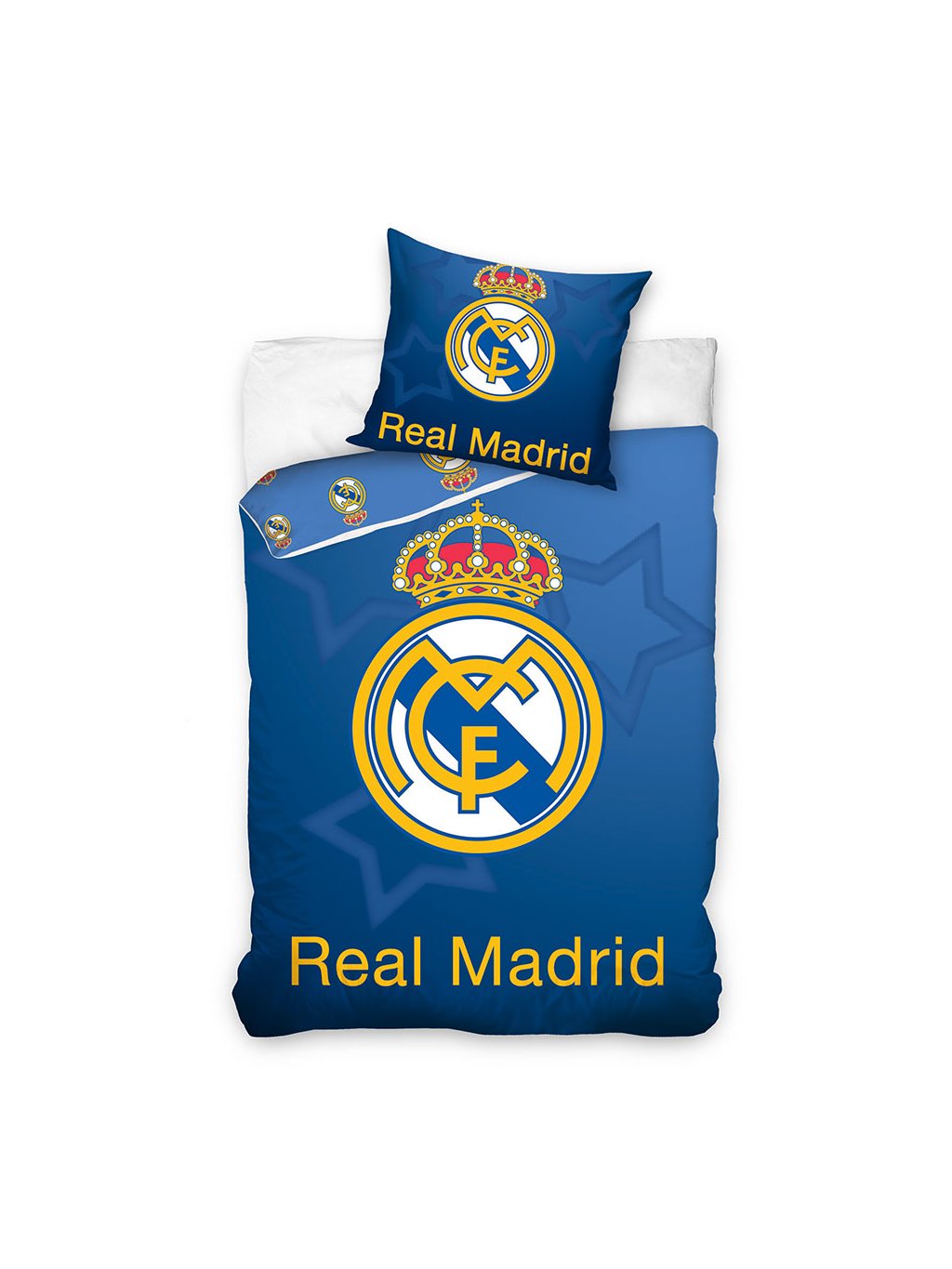 Stylové povlečení Real Madrid v moderním modrém designu potěší každého fanouška slavného madridského klubu. Dominantou je velký klubový znak doplněný zlatým nápisem Real Madrid a jemným hvězdným motivem v pozadí, který dodává povlečení výrazný sportovní styl.