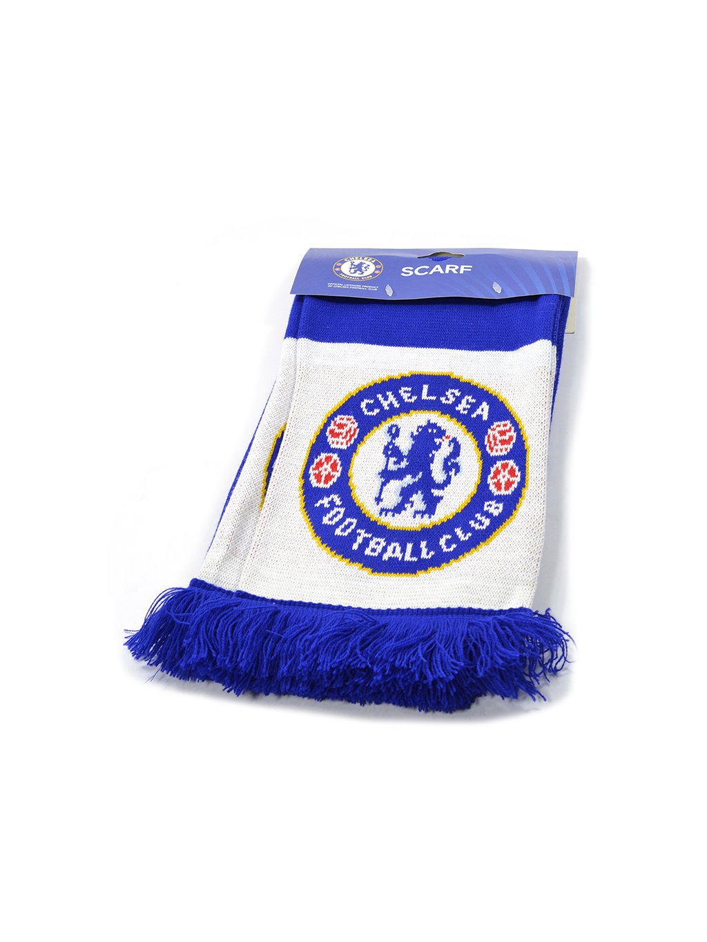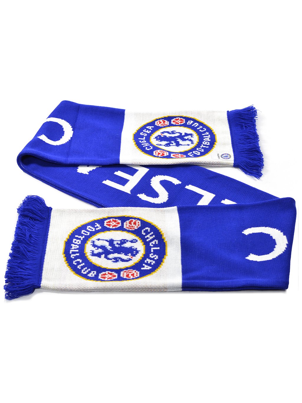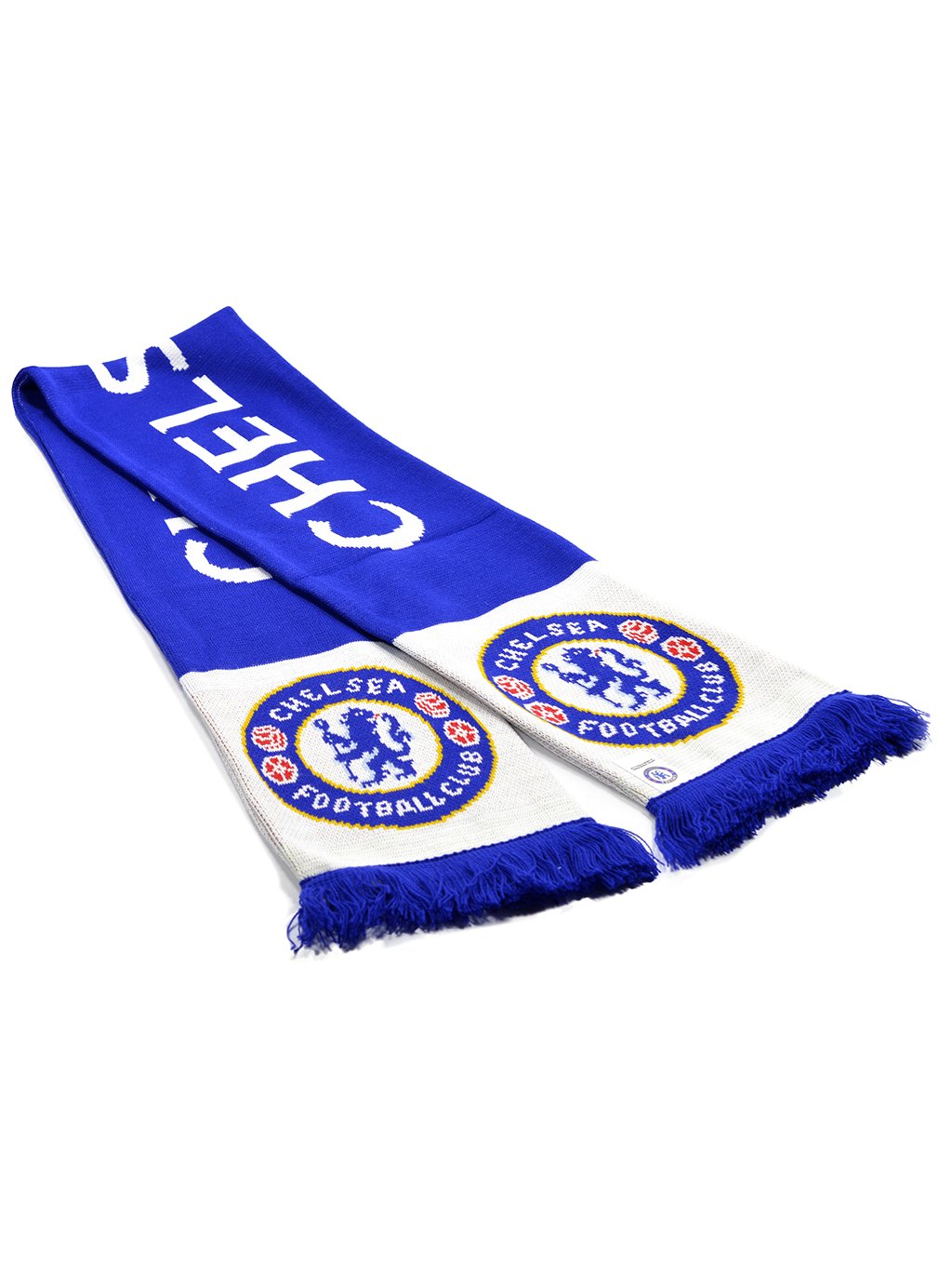 Stylová pletená šála Chelsea FC s výrazným nápisem a kontrastními lemy. Ideální doplněk pro fanoušky, který vás zahřeje na stadionu i ve městě.