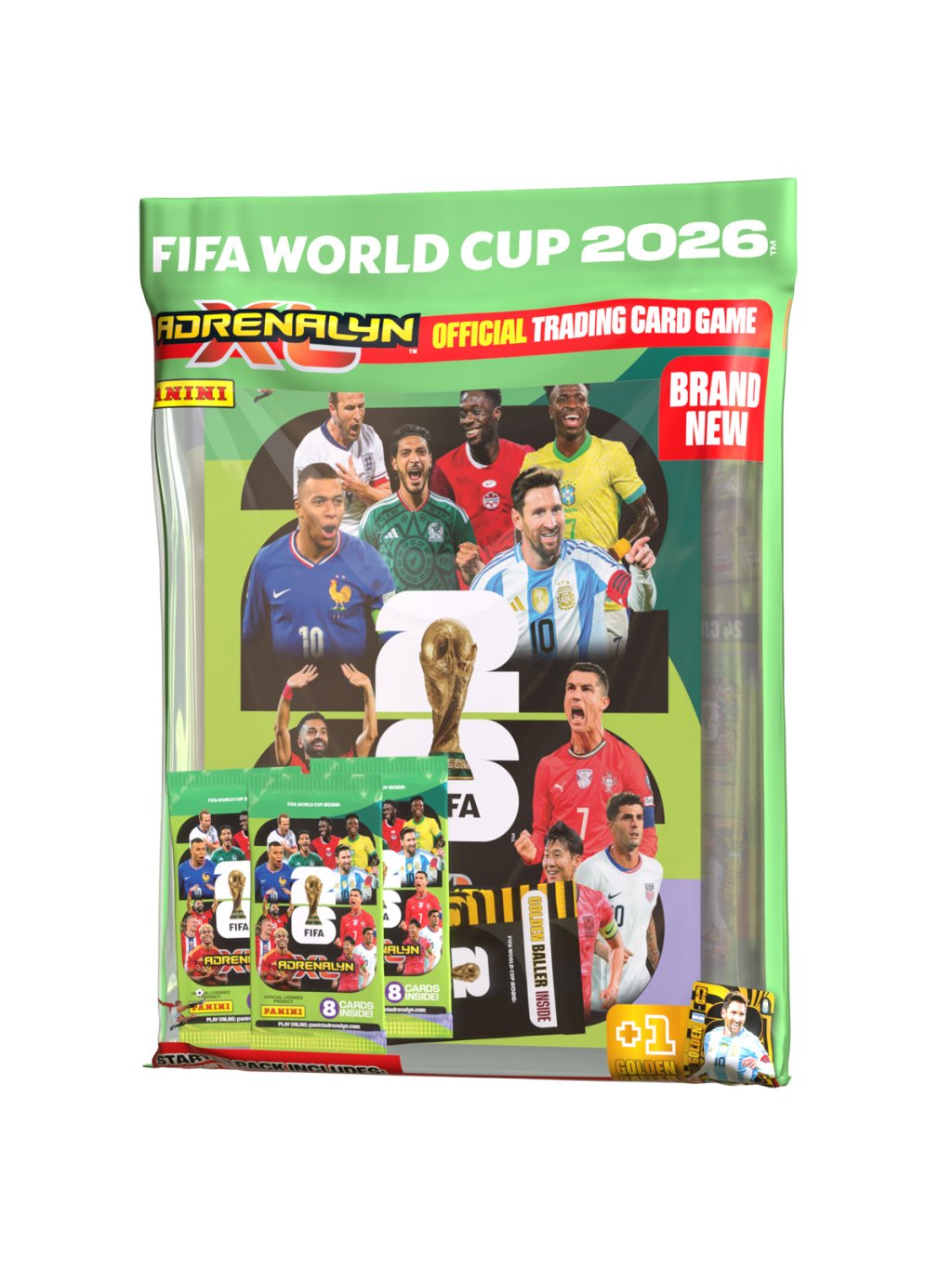 Startovací sada FIFA WORLD CUP 2026 obsahuje: 32 karet (4 balíčky), 3x limitované karty, 1x Golden Ball karta, 1 COIN kartu, sběratelské album, sběratelskou příručku, herní plán.