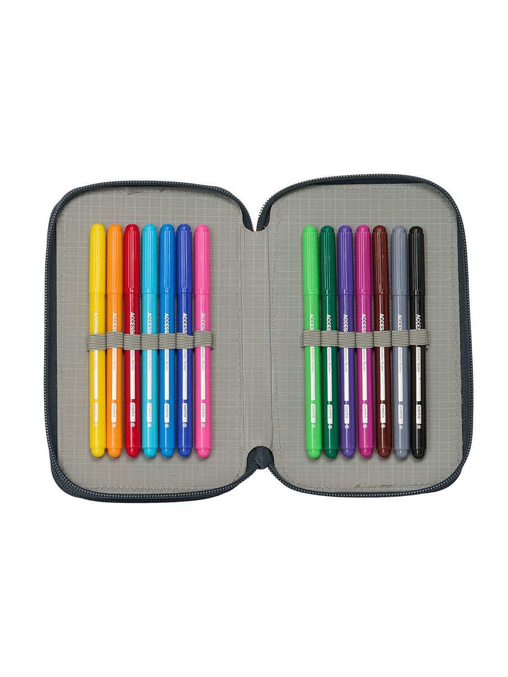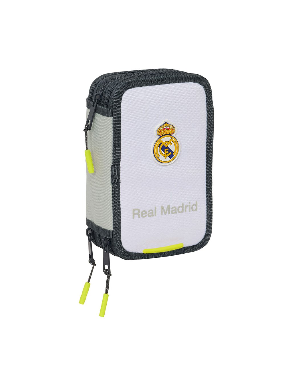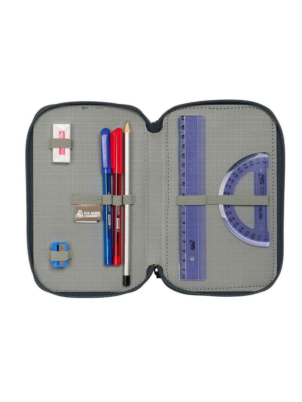 Trojpatrový penál Real Madrid je doporučený pro fanoušky fotbalu, obsahuje 37 kusů školních potřeb – gumu, tužku, modro-červené pero, ořezávátko, modrou pravítko s rytím, úhloměr, 16 dřevěných pastelek a 14 fixů. Penál má tři samostatné přihrádky pro snadnou organizaci. S rozměry 125 × 55 × 195 mm a je praktickým pomocníkem do školy.