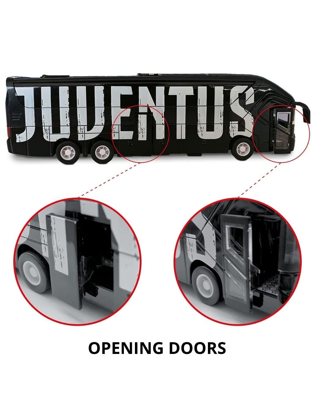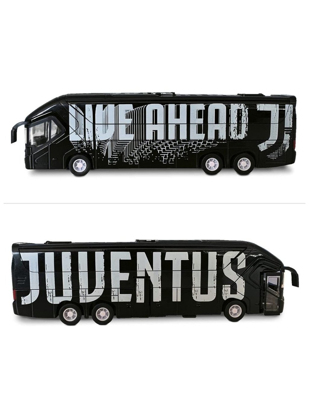 Detailně zpracovaný model klubového autobusu Juventusu věrně kopíruje originální vůz, který tým převáží na zápasy po celé Itálii. Díky pull-back pohonu se autobus po zatažení sám rozjede a ručně otevírací dveře dodávají modelu realistický charakter. Skvělý sběratelský kousek i dárek pro fanoušky Staré dámy.