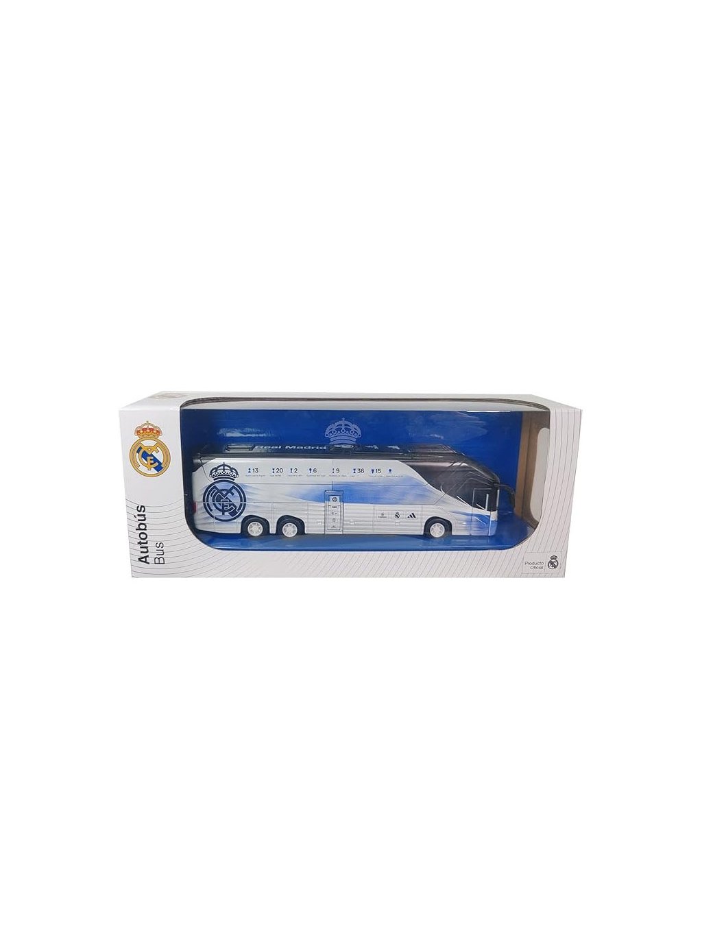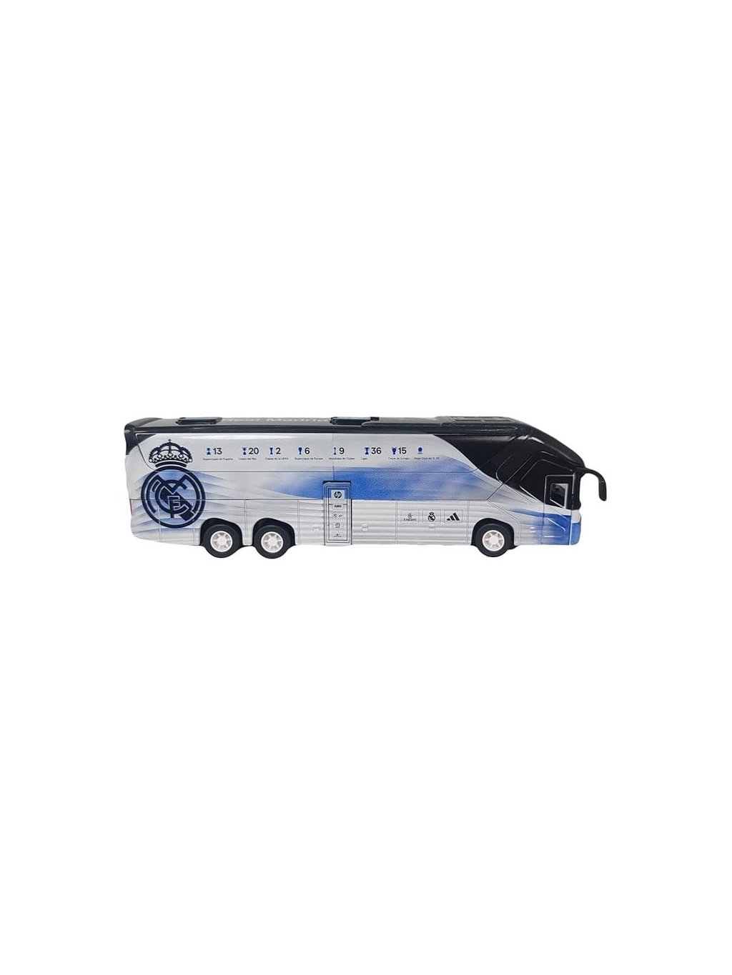 Detailně zpracovaný kovový model klubového autobusu Real Madrid potěší fanoušky i sběratele. Autobus má otevírací boční dveře a je vybaven zpětným třecím pohonem (reverse friction), díky kterému se po zatažení sám rozjede. Pevná kovová konstrukce zajišťuje vysokou odolnost a realistický vzhled.
